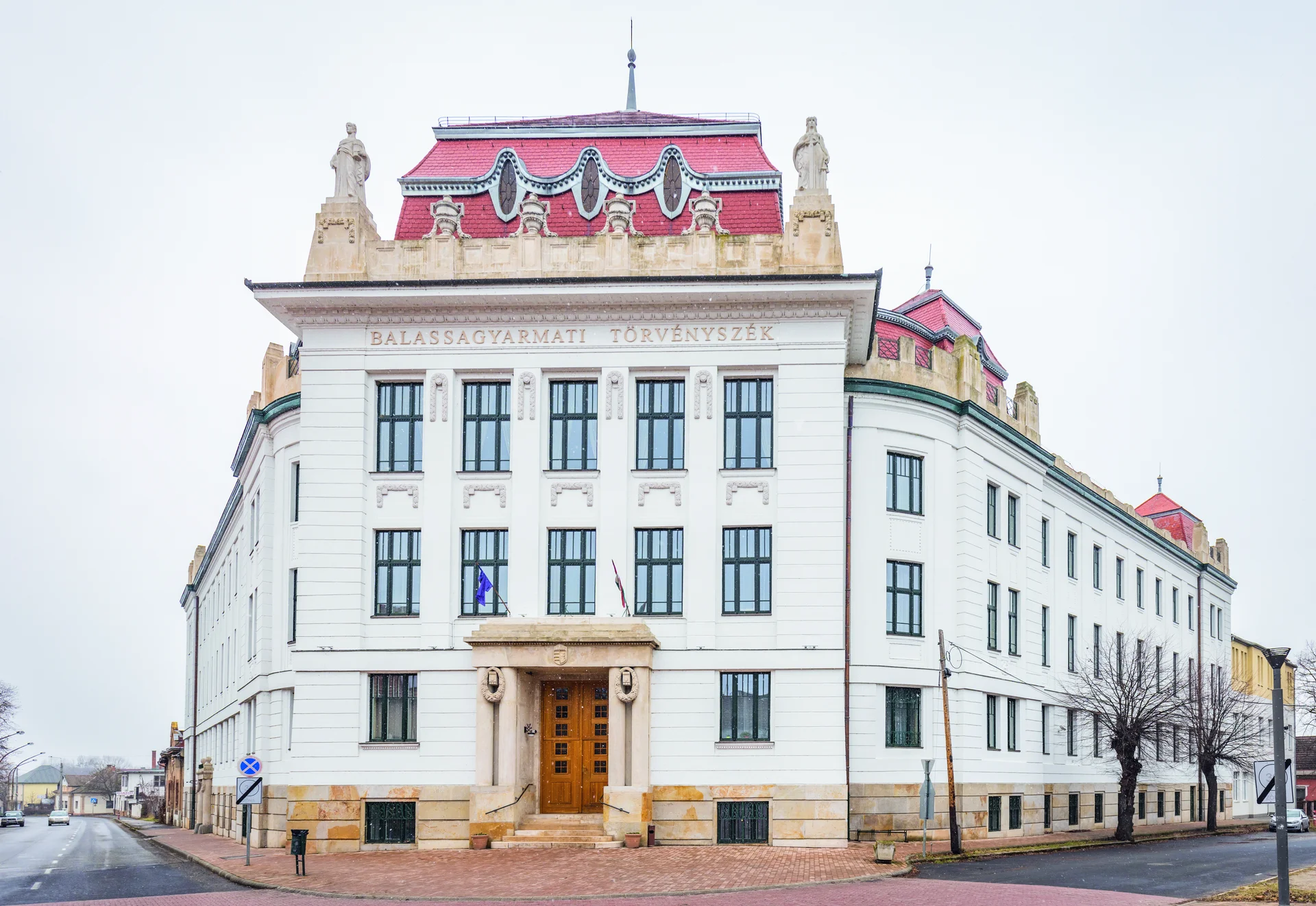 Nógrád történelmi székvárosának központjában állnak a közigazgatás impozáns palotái. A klasszicista Vármegyeháza szomszédságában 1912-ben adták át a Törvényszék épületét. A korabeli magyar állam különösen nagy figyelmet fordított a bírósági épületek méltó kialakítására, egymást követve épültek az Igazságügyi palotának nevezett együttesek Kolozsvártól Kecskeméten és Kassán át Szombathelyig, ezzel is hozzájárulva a történelmi Magyarország városainak egységes képéhez. A törvényszékre kiírt pályázatot a győri városháza építésze, Hübner Jenő nyerte, a szecessziót a klasszikus formajegyekkel vegyítő tervével. A teleksarkot átlósan levágó, kiemelt épülettömegben helyezkednek el a tanácstermek, amiket kupola, illetve az Ítélethozó és az Igazság hatalmas szobra koronáz meg.