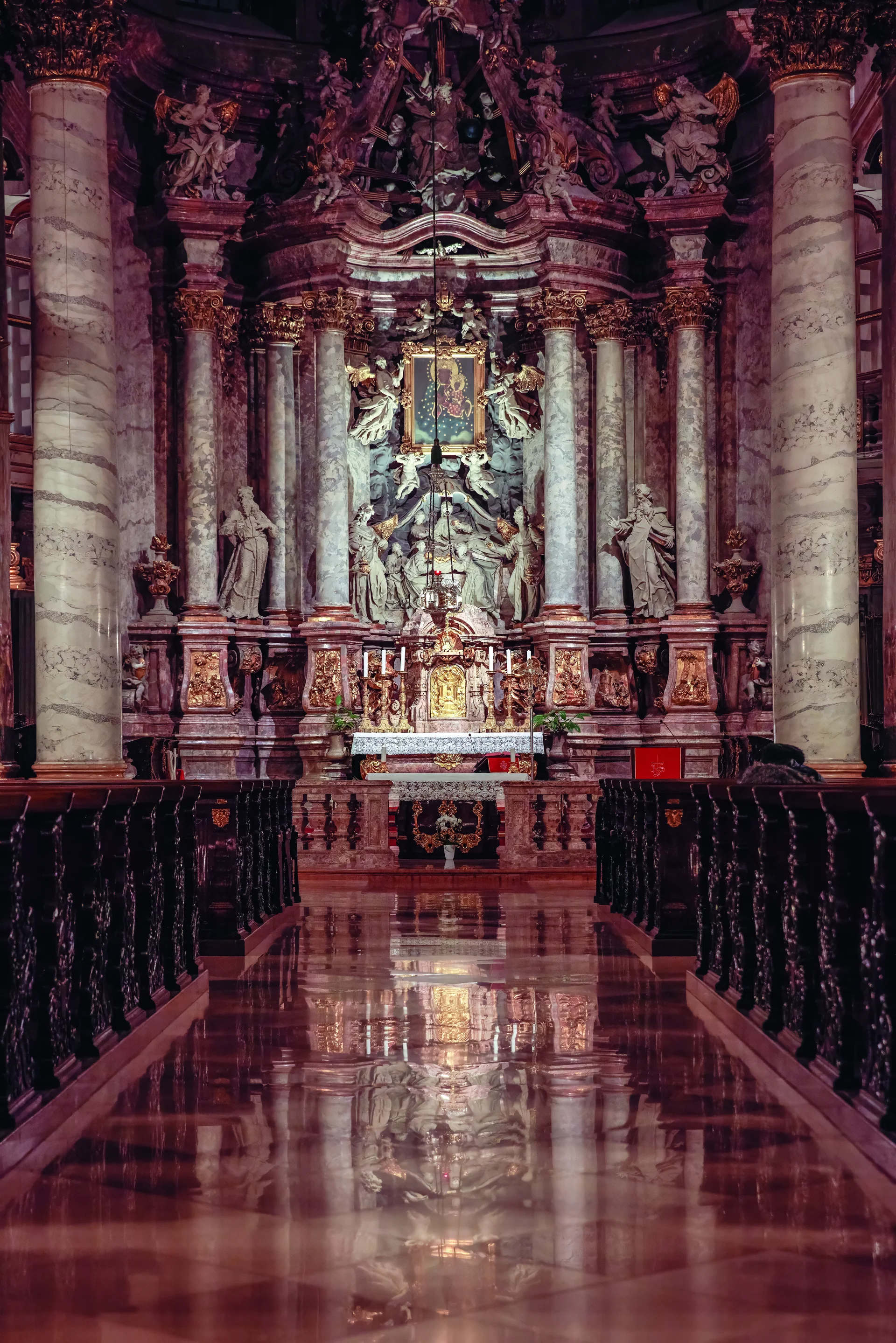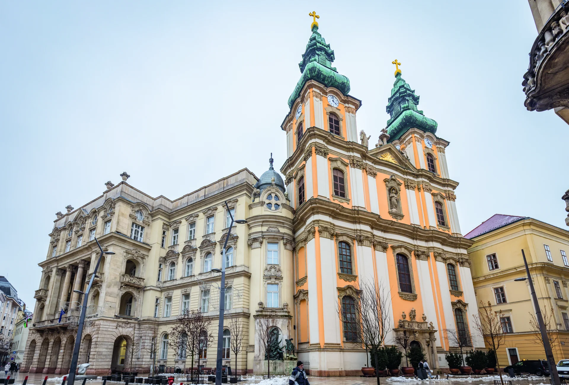 A pesti belváros meghatározó épületegyüttese az egykori pálos, ma Egyetemi templom, és az ELTE Állam- és Jogtudományi Karának neobarokk palotája. A pálosok a török uralom után kapták meg telküket, ezen épült fel az impozáns templom Mayerhoffer András salzburgi születésű, hazánkban alkotó építőmester tervei szerint. A II. József idején felszámolt kolostorba 1805-ben költözött a Pázmány Péter esztergomi érsek által 1635-ben alapított nagyszombati egyetem. A Pesti Királyi Tudományegyetem a 19. század végére világszínvonalú intézménnyé vált, így egy új központi épület létesítését határozták el. A kolostor bontása során a templomot megőrizték, így a századfordulóra – a Kisboldogasszony-templom stílusához igazodva – impozáns neobarokk palota született, ami a szomszédos utcákban álló korábbi épületszárnyakhoz is csatlakozott. Az építészek a kupola kialakításánál a gödöllői királyi kastélyon is látható formát választották, ami tiszteletadás Mayerhoffernek, aki a templom mellett a kastélyt is megalkotta. A templom felújítása 2020-ban fejeződött be, 2024-ig pedig az egyetemi szárnyak homlokzatának átfogó helyreállítása, valamint szigetelési munkák zajlottak, emellett tervben van a főépület II. világháborúban elpusztult kupolájának helyreállítása is.