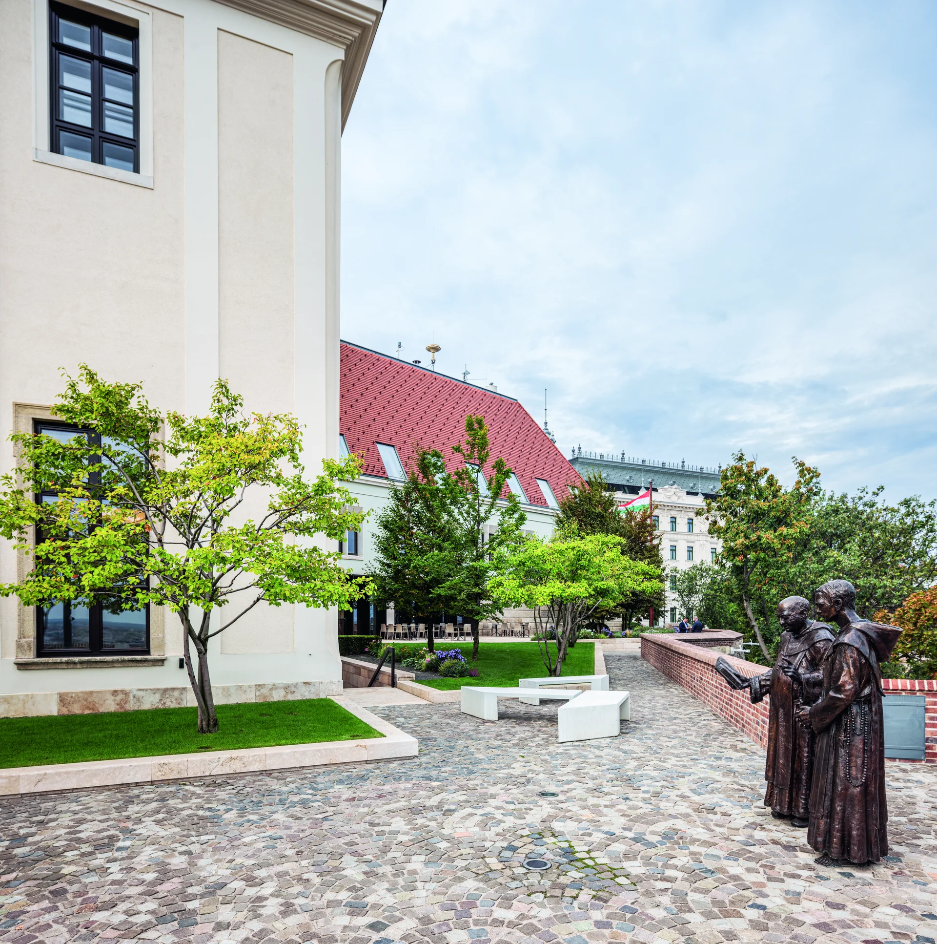 Ha budai Várnegyed épületei beszélni tudnának, a ma a Miniszterelnökségnek otthont adó egykori karmelita kolostor mesélné talán a legváltozatosabb történetet. A helyszínen a középkorban a ferencesek Szent János-temploma és kolostora állt, amit IV. Béla alapított. 1301-ben itt temették el az utolsó Árpád-házi királyt, III. Andrást. A török korban a megmaradt falrészek felhasználásával mecset létesült, amely Buda 1686-os ostromában dőlt romba. A telket a visszafoglalás után a jezsuiták, majd 1693-tól a karmeliták kapták meg; templomuk alapkövét 1725-ben tették le, a késő barokk, copf stílusú együttest 1736-ra fejezték be. A térszerkezet két fő részből áll: a belső udvar köré szervezett, kétemeletes rendházból és a hozzá kapcsolódó, egyhajós templomszárnyból, amely eredetileg tornyos homlokzattal zárta le a telek déli oldalát. II. József 1784-ben feloszlatta a rendet, az épületegyüttes állami-közösségi funkciókat kapott, tehát névadói még fél évszázadot sem tölthettek el falai között. A templomot 1787-től színházzá alakították; az áttervezést Kempelen Farkas készítette. A sakkgépével világhírűvé vált polihisztor ugyanis nemcsak feltaláló volt, hanem a kor mérnök-építésze is: vízellátási és vízemelő munkáit dicséri Schönbrunn vízrendszere, illetve a pozsonyi és a budai vár vízműmegoldásai is. Tervei és a szintén általa irányított kivitelezés nyomán megszületett a Várszínház, Budán az első állandó kőszínház, ahol 1790 októberében volt az első magyar nyelvű előadás. A 19. század klasszicista beavatkozásai alakították a homlokzatot, de a 20. század újra hányatott sorsot hozott: szerkezeti gondok miatt a játszóhely 1924-ben bezárt, a háborúban az együttes súlyosan sérült, majd a helyreállítás évtizedekig húzódott. 1978-ban nyitották meg újra – váltakozó társulatokkal és funkciókkal –, később a Nemzeti Táncszínház működött benne. A 2016–2019 közötti, Zoboki Gábor tervei alapján a ZDA-Zoboki Építésziroda munkájával született rekonstrukció a műemléki fegyelem és a korszerű működés egyensúlyát kereste: visszanyitották a befalazott nyílásokat, kibontották a későbbi födémeket a templomszárnyban, rejtetten integrálták a technológiát, és a kolostori alaprajz rendjében szervezték újra a hivatali és protokolláris tereket. A belsők tudatosan visszafogottak, a hófehér falak, a sötét fapadlók és a mértékletes elegancia azonban itt többet jelent puszta építészeti stílusnál. A puritánság finoman emlékeztet arra, hogy a „miniszter” szó eredeti jelentése alapján szolgálat. Ugyanakkor a reprezentatív terek és az új, Duna felé nyíló erkély – mint egy vezérhajó orra – egyedülálló panorámát kínál a vendégeknek: a történelmi helyszín méltó keretben mutatja meg Magyarország és a magyar kultúra szépségét és jelentőségét. 2019. január 1-jétől a Miniszterelnökség költözött a felújított épületegyüttesbe. Az udvar csendje és a kőfalak fegyelme ma is őrzi a szerzetesi eredetet, miközben az épületegyütteshez kiegészítésként illesztett új irodatömeg és a gondosan rendezett környezet a 21. századi állam működéséhez ad praktikus hátteret.