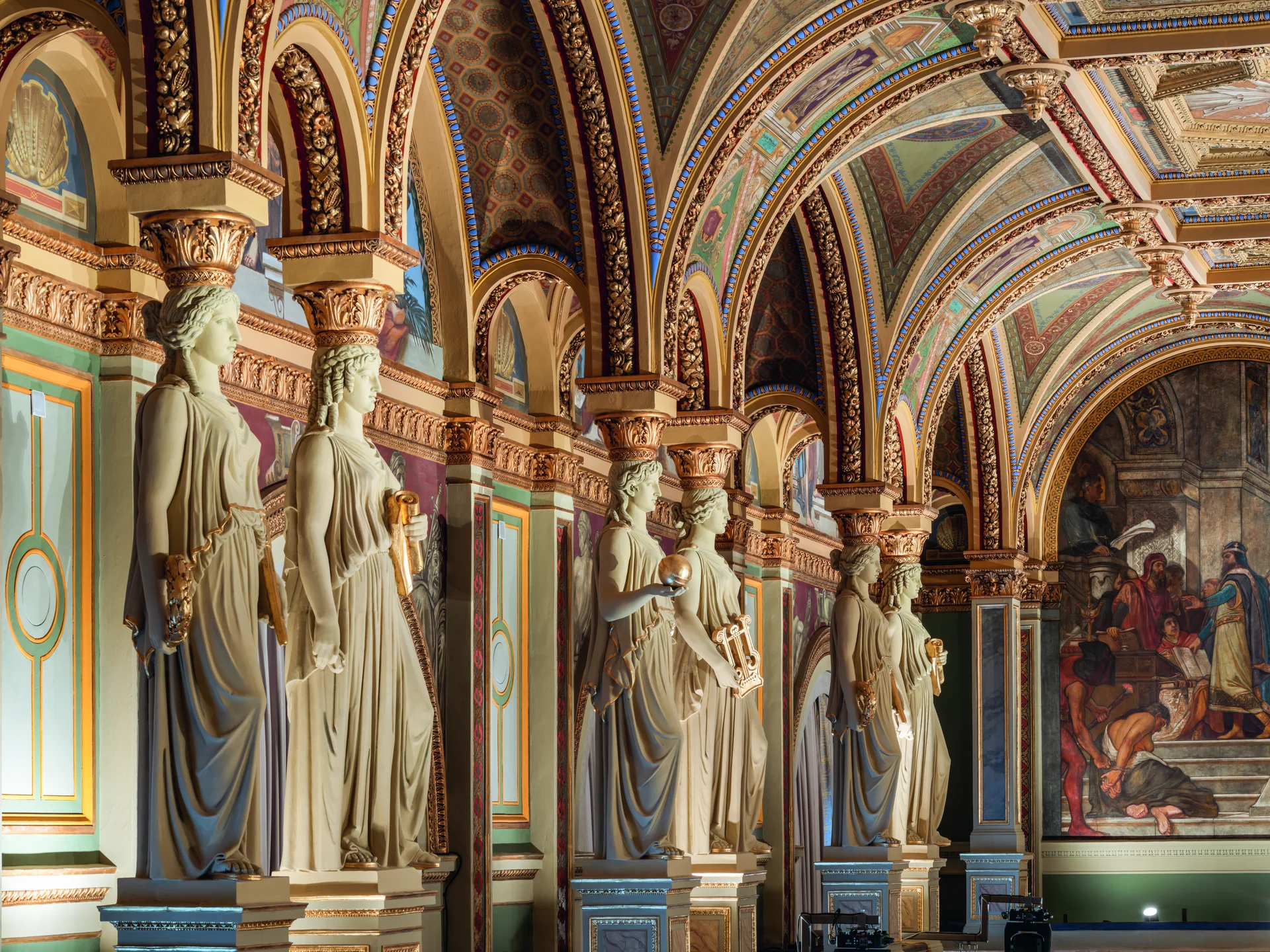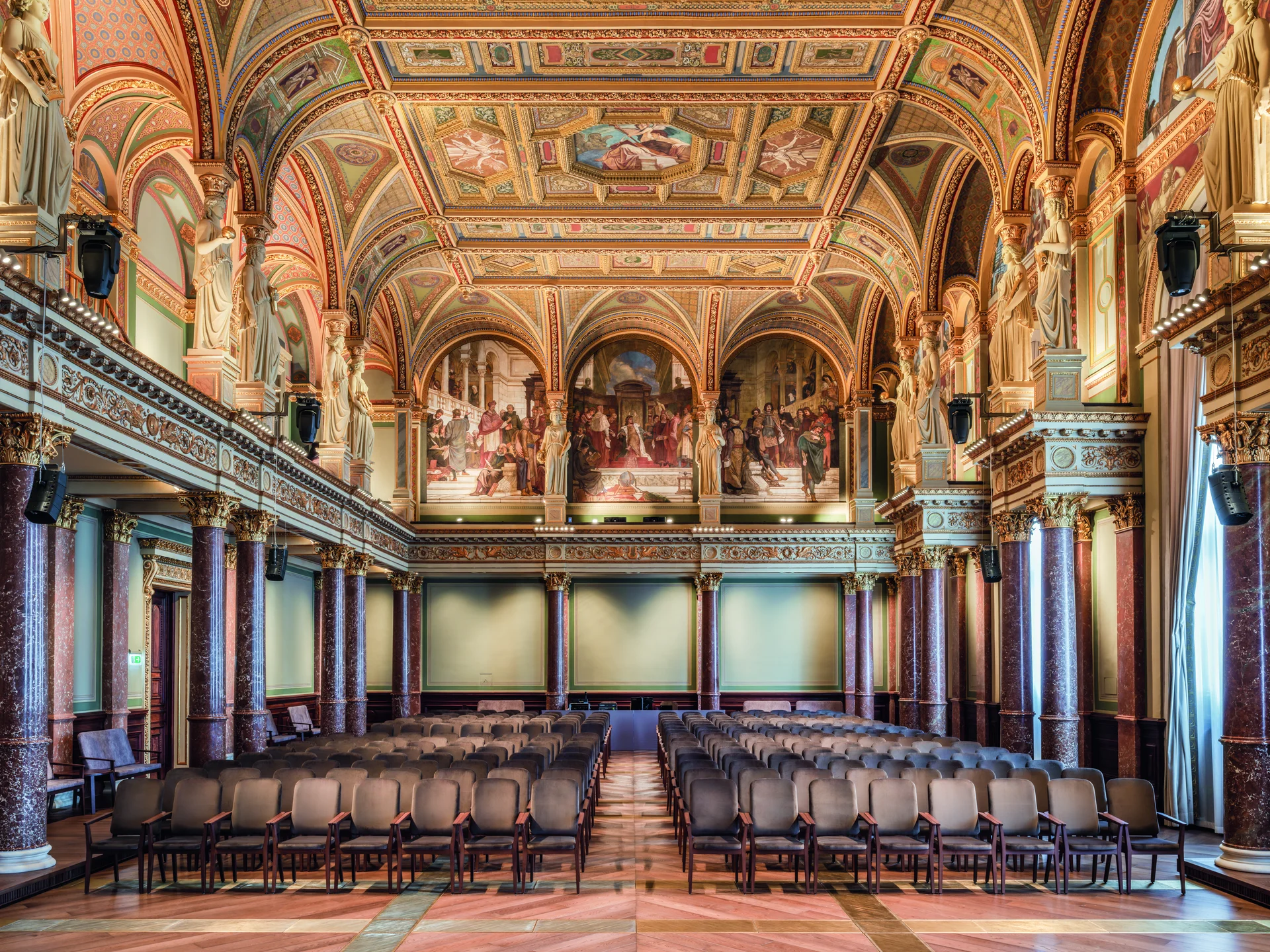 A Széchenyi István nevezetes országgyűlési felajánlása után megalakult Magyar Tudós Társaság, vagyis a mai Magyar Tudományos Akadémia évtizedekig nem rendelkezett méltó székházzal. Az 1861-ben kiírt tervpályázat sikertelenül zárult, ezért felkérték Leo von Klenze müncheni és Friedrich August Stüler berlini építészt, a korszak két európai meghatározó mesterét egy-egy terv elkészítésére. Végül Stüler elképzelései nyerték el az akadémia vezetőinek tetszését, és el is kezdődött az építkezés. Stüler kiforrott neoreneszánsz formanyelve jól felismerhetővé teszi az általa tervezett épületeket. Az 1865-re elkészülő székház leginkább a stockholmi svéd nemzeti múzeummal állítható párhuzamba. Az építkezést a Berlinben élő mester nevében a fiatal Ybl és Szkalnitzky Antal vezették, számos egyedi megoldással és technikai újdonsággal gazdagítva az épületet. Noha a tervező külföldi – ami nem kis felháborodást keltett –, az iparosok és művészek döntő többsége hazai volt, csupán a kerámiaszobrok érkeztek Berlinből (a Zsolnay gyár ekkor még nem létezett). Az impozáns Duna-parti székház volt az első neoreneszánsz középület hazánkban, ezzel indult el a főleg Ybl neve által fémjelzett stílus diadalútja, melynek eredményeként a 19. század végére szinte nemzeti formanyelvvé vált. Az épület többféle funkciónak is helyet adott – az akadémia jelentős képgyűjteményét is itt helyezték el, a székház mögött fontos bevételi forrást jelentő akadémiai bérház épült, ezt külön megbízás keretében Ybl tervezte. A két épületet később összekapcsolták, az egykori bérlakások helyén lelt otthonra többek között az intézmény könyvtára. A székház legfontosabb helyisége természetesen a kétszintes díszterem, aminek hatalmas ablakai a homlokzatot is meghatározzák. Az átadáskor a terem még nem volt használható, Lotz Károly lenyűgöző, a tudomány és a művészet egyes ágait ábrázoló secco technikával készült festései 1881-ben készültek el. Ezzel létrejött Magyarország egyik legszebb reprezentatív enteriőrje, amit a nagyközönség talán kevéssé ismer. A székház felújításának első üteme 2025-ben, az intézmény alapításának kétszázadik, az épület átadásának 160. évfordulóján zárult. A főhomlokzatot érintő apró, de fontos kiegészítés, hogy a párkány sarkaira visszakerültek a történelem viharai által elsodort szfinxek. A legnagyobb beavatkozás a dísztermet érintette, itt a festőrestaurátok végeztek hatalmas munkát Verebes Dóra vezetésével. Nem mindennapi kihívást jelentett a terem szerkezete, ugyanis Ybl a mennyezetet egy keretre függesztette fel, a tetőszerkezet és a terem feletti helyiségek falainak súlyát így nem a terem födéme hordozza, hanem külön vasszerkezetek. A munkában részt vevők számára külön meglepetést és örömet jelentett, hogy a mennyezet közepén megtalálták a magyar címert, amit a kommunizmus alatt el akartak távolítani, ám a munkások csak eltakarták azt. A felvitt anyag ráadásul nem roncsolta az eredeti festést, így könnyen el lehetett távolítani.