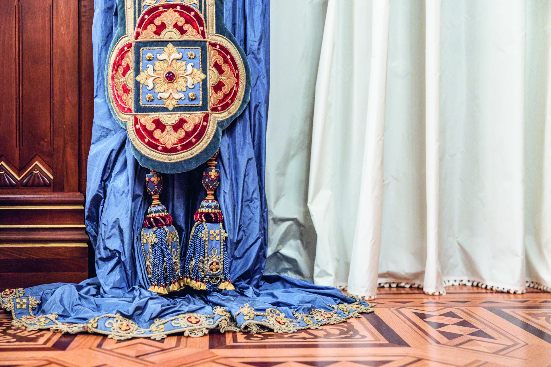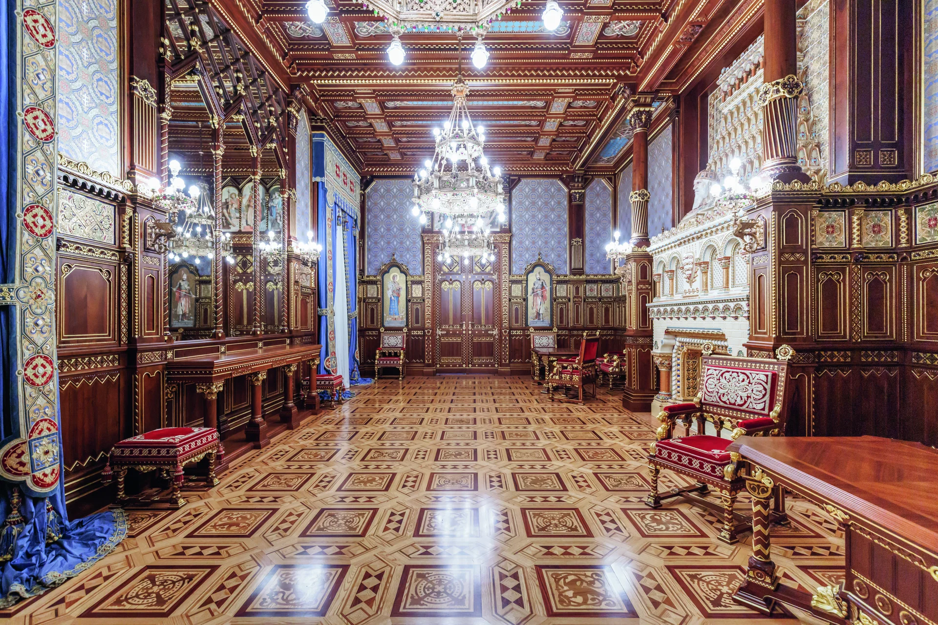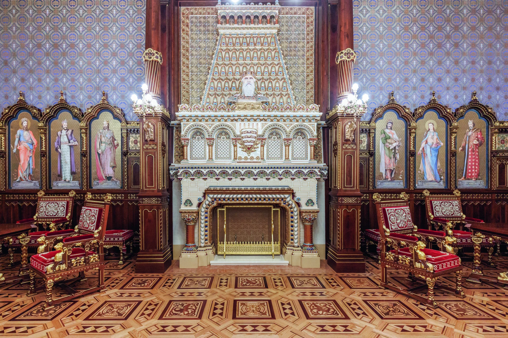 A Budavári Palota első rekonstruált terme annak idején egy átgondolt koncepció keretében épült meg. A rezidencia átépítésekor született meg az elképzelés, hogy az egyes épületszárnyakban a magyar uralkodóházaknak emléket állító termek létesüljenek, melyeket az adott korra jellemző stílusban alakítanak ki: így jött létre az épület középtengelyében, a kupola alatt a neobarokk Habsburg terem, az akkor felépített krisztinavárosi szárnyban a neoreneszánsz Hunyadi terem, végül a két szárnyat összekötő nyaktagban az Árpád-háznak, illetve a kifejezetten Szent Istvánnak emléket állító helyiség. Az ősök előtti tisztelgés mellett a magyar iparművészet akkori fejlettségét is demonstrálni akarták, nem véletlen, hogy először nem is a várban, hanem az 1900-as párizsi világkiállításon építették fel a termet, ahol több díjat is elnyertek vele az alkotók. Hauszmann Alajos kifejezett szándéka volt, hogy lehetőleg magyar mesterekkel és művészekkel dolgozzon a palotán, és ez még inkább igaz a Szent István teremre, ami tulajdonképpen a magyar iparművészeti ágak egyfajta bemutatóterme. A faburkolatokat és bútorokat Thék Endre műhelye, a textíliákat a Haas Fülöp és Fiai vállalat szállította, egyedül az aranyhímzések készültek Franciaországban. A kerámiaelemek, így a kandalló és a királyokat ábrázoló, Roskovics Ignác festményei alapján megformált csempeképeket természetesen a pécsi Zsolnay gyárban készíttették. Az akkoriban újdonságnak számító elektromos berendezéseket és izzókat a frissen alakult Tungsram biztosította. Az 1902-ben átadott termet a maihoz hasonló érdeklődés övezte, vezetések során tekinthették meg az érdeklődők. A terem a II. világháborús ostrom során, illetve az akkor kitörő tűzben szinte teljes egészében megsemmisült. Ha lett is volna lehetőség a helyreállításra, az már ideológiai okokból sem történhetett meg. Az újjáépítés során a Hauszmann-féle együttes egyetlen helyiségét sem rekonstruálták, a Szent István terem helyére a Budapesti Történeti Múzeum kutatószobái kerültek. A termet tartalmazó épületszárny város felé néző homlokzatát sem tartották meg, a neobarokk architektúrát leegyszerűsített formákra cserélték. Az udvarra néző homlokzat szerencsére megmaradt, ott „csupán” az oromzatot bontották le, és kicserélték a különleges, ívelt ablakokat. A terem és a hozzá kapcsolódó helyiségek, valamint a földszinti előcsarnok rekonstrukciójának tervezése 2015 körül kezdődött Potzner Ferenc irányításával, aki a Várkertbazár felújítását is vezette. A későbbiekben Angyal Tibor építész és Rostás Péter művészettörténész folytatták a munkát, természetesen egy egész csapat vezetőiként, így a kapcsolódó termek helyreállítását Baliga Kornél tervezte. A terem eredeti tervei és számos archív fénykép is fennmaradt, ebből lehetett és kellett kiszerkeszteni a legkisebb részleteket is. A rekonstrukcióhoz fontos további forrást jelentett a terem másolata is: az avatás után pár évvel ugyanis Groedel Ármin fakereskedő terézvárosi, Lendvay utcai villájában felépíttette a terem egyszerűsített mását. Ebben az azóta átalakított helyiségben ma ortodox kápolna működik, de számos részlet megvizsgálható volt, ami nagyban segítette a kutatást és a tervezést. Az építkezés 2019-ben indult, és szinte azonnal, a bontások és a feltárás során kellemes meglepetések érték a szakembereket: több eredeti részlet is előkerült, így az előcsarnok oszlopai, számos stukkórészlet Hauszmann idejéből, de barokk kori és középkori leletek is napvilágot láttak. A terem helyreállítása a magyar iparművészet ismételt diadala: a faburkolatokat, a padlót, a bútorokat és ajtókat, a kárpitokat mind hazai műhelyek és cégek készítették. Természetesen a Zsolnay gyár is részt vállalt a munkából, számukra különleges kihívást jelentett a porcelánra festett királyportrék rekonstruálása: minden szín felhordása és az aranyozás után ki kellett égetni a táblákat úgy, hogy a színek ne olvadjanak egybe, ráadásul minden árnyalat különböző hőfokot igényelt. Magát a festést Ódor István Bence festőművész végezte, aki nagy tapasztalattal rendelkezik fotórealisztikus alkotások készítésében. A kandalló töredéke is előkerült, ami alapján pontosan be lehetett azonosítani a színeket, azonban ennek rekonstrukciója sem volt egyszerű, hiszen az elemek térfogata megváltozik az égetés során. Az egyes elemek újraalkotásánál is nehezebb feladatot jelentett a helyszínen történő összeépítés, hiszen minden milliméter számított. A folyosó stukkódíszítését is aprólékos gonddal rekonstruálták, melynél érdekes kontrasztot alkotnak a feltárt, az 1945-ös tűzben elfeketedett eredeti elemek. Az eredmény önmagáért beszél, a Szent István terem ma a legkisebb részletekig megegyezik azzal, aminek a párizsi világkiállítás közönsége is csodájára járt 1900-ban. Ez a díszterem volt a háborúban elpusztult palota talán legösszetettebb, legkülönlegesebb helyisége. Ezért is volt érdemes itt elkezdeni a rekonstrukciót, hiszen mind a kutatók, mind az építészek, mind a mesterek rendkívül sok tapasztalatot szereztek a későbbi munkákhoz – a palota legnagyobb része ugyanis még újjáépítésre vár.