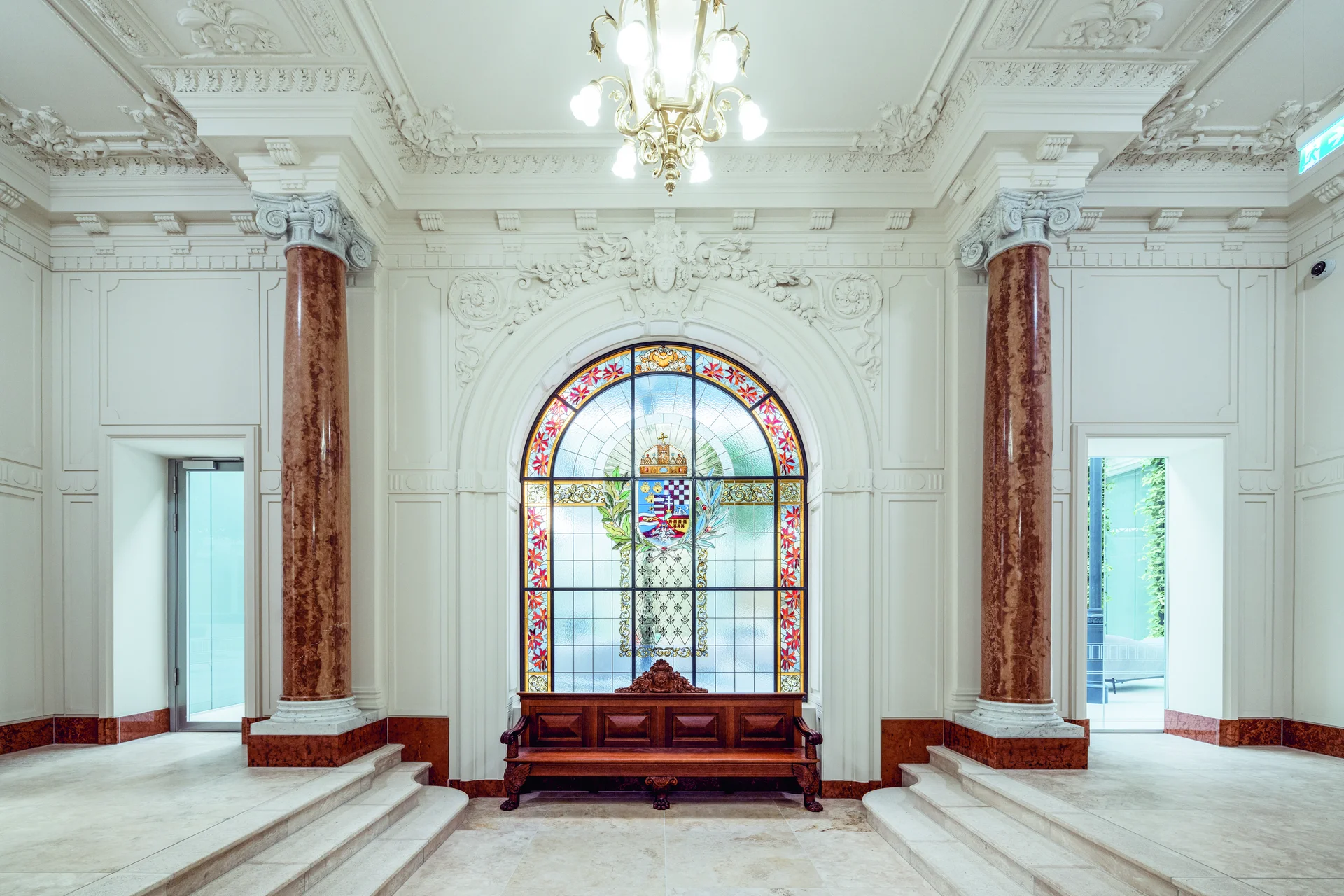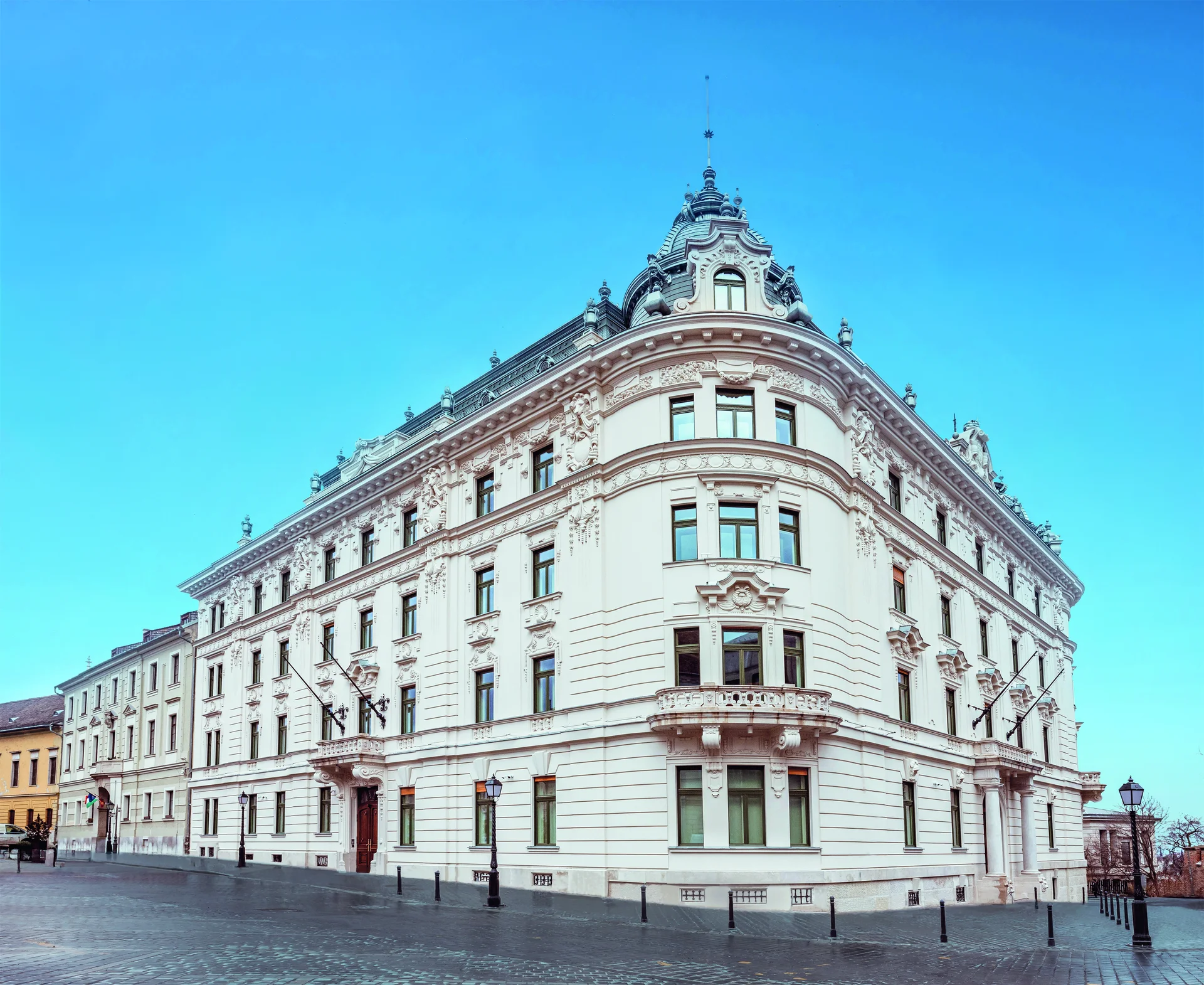 A Magyar Szent Korona Országainak Vörös-kereszt Egylete 1900-ban vásárolta meg a budai Dísz téri telket. Hauszmann Alajos és veje, Hültl Dezső tervezte az eklektikus, szecessziós palotát, melynek különlegessége, hogy külön bejáratok szolgálták a székházat, illetve a felsőbb szinteken elhelyezett bérlakásokat. A díszlépcsőházat feltehetőleg Róth Miksa üvegmozaikja díszítette, az emeletek között lift ingázott, a lakásokban pedig villany- és gázvilágítás, valamint fürdőszoba is volt. A később a Külügyminisztériumnak helyet adó historizáló palota a II. világháború végéig a budai Várnegyed meghatározó eleme volt, mely még a háborús sérülései ellenére is megmenthető lett volna, de 1946-ban ideológiai okokból lebontották. A rekonstrukció az eredeti homlokzat és a reprezentatív helyiségek visszaállítását tűzte ki célul. A terveket archív fotók és régészeti feltárások alapján készítették. Az épület követi az eredeti eklektikus, ötszintes kialakítást, a belső udvar üveglefedésével pedig tágas átriumot alakítottak ki benne.