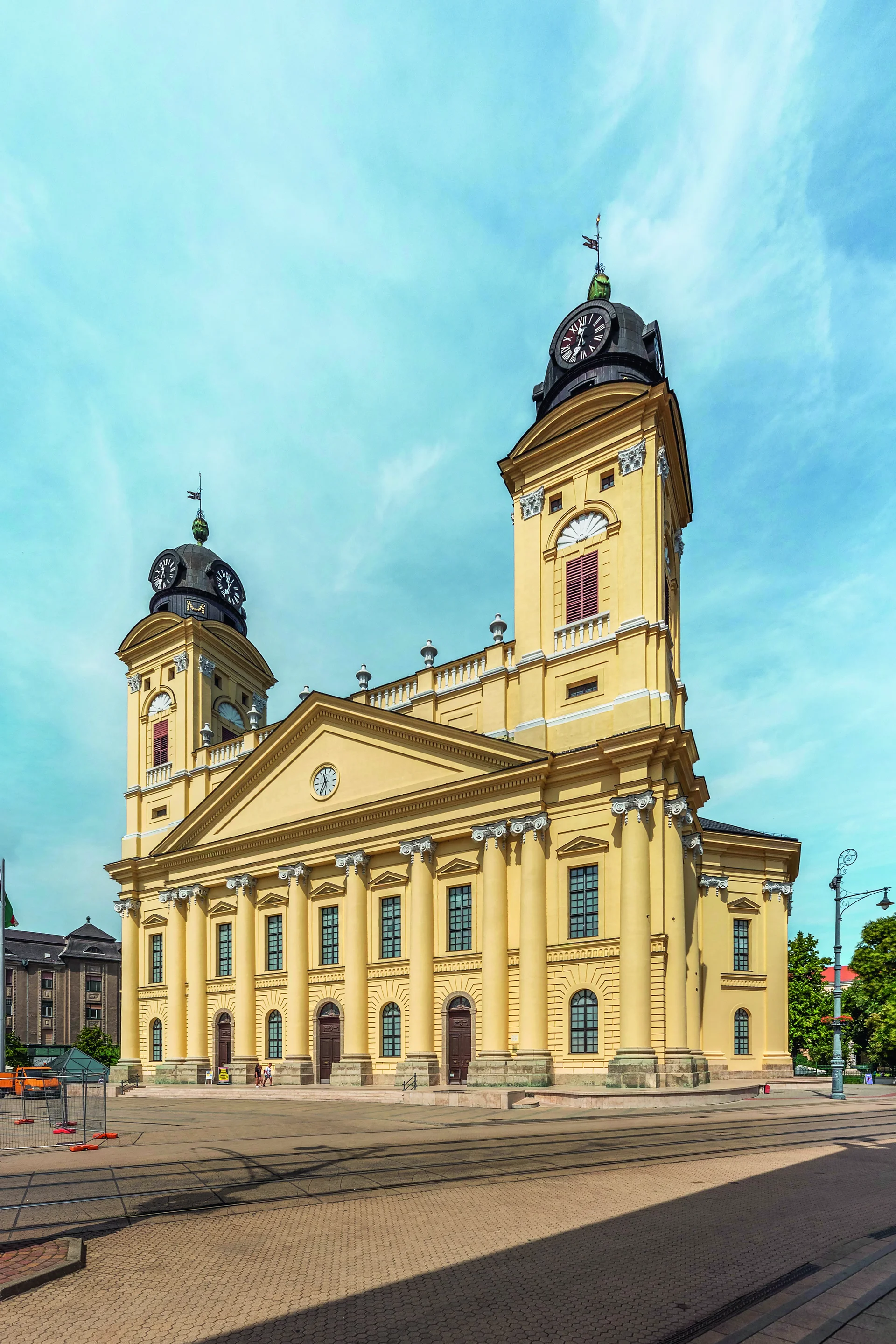A kálvinista Rómának is nevezett város építészeti és szellemi központja a nevéhez méltó méretű Nagytemplom. Az épület elődje a gótikus Szent András-templom 1802-ben, a város nagy részét elpusztító tűzvészben leégett. Az újjáépítéshez a hírhedten fukar városi tanács tervváltozatok egész sorát készíttette el Péchy Mihállyal, a tehetséges hadmérnökkel. Az első variációk még a középkori templom teljes bontásával számoltak, helyén rendkívül hatalmas és merész formájú, 45 méter átmérőjű kupolával fedett kerektemplommal. Ahogy készültek az újabb és újabb tervek, úgy vált egyre feszültebbé a viszony a városatyák és Péchy között. Mikor 1805-ben lebontották a régi templom maradványait, Péchynek az ötödik javaslatát utasították el. A munkát tervek nélkül nem kezdhették meg, ezért a Helytartótanács megbízta Talherr Józsefet, az Országos Építészeti Igazgatóság vezetését, hogy a középkori alapok felhasználásával, valamint Péchy variációinak figyelembevételével készítsen új terveket. Így alakult ki a templom különleges, elnyújtott alaprajzú elrendezése. Közben Péchy díjazás nélkül két újabb változatot dolgozott ki, a hetedik már alkalmazkodott a korábbi templomhoz: két, egymástól távol eső torony, közöttük pedig hatalmas kupola szerepelt az elkészült rajzokon. A megbízók eddigre már elveszni látszottak a tervváltozatok és az építőmesterek között, ezért úgy döntöttek, hogy egy harmadik építőmestert bíznak meg, hogy egységesítse az elképzeléseket és elindítsa a munkát. A gyöngyösi Rabl Károly már komoly szaktekintélynek számított, többtucat hidat és templomot tervezett. Megbízása szerint egyesítenie kellett Talherr alaprajzát Péchy hetedik tervével, de kupola nélkül. Így 1808-ban végül elindulhatott az építkezés, 1821-re a templom nagyjából készen állt. Péchy ekkorra már teljesen visszavonult a munkától, elképzeléseit, sőt szerzői jogait is figyelmen kívül hagyták, mikor tervét önkényesen megváltoztatták. A kupola elhagyásával ráadásul aránytalanná vált az épület, ugyanis a két távol eső torony között kellemetlen hatású űr keletkezett. Rabl ezt úgy orvosolta, hogy mellvédfalat emelt a hatalmas timpanon fölé, amit a tengelyeknek megfelelő osztásban urnadíszekkel koronázott. Ezzel fejeződött be a templom hosszúra nyúlt építése, ami minden méltánytalanság és szükségmegoldás ellenére építészetünk egyik kiemelkedő alkotása lett. Az épület hamarosan fontos történelmi helyszínné is vált: 1849. április 14-én az itt ülésező nemzetgyűlés mondta ki a Habsburg-ház trónfosztását és fogadta el a magyar függetlenségi nyilatkozatot. A templom ráadásul mintaadóvá is vált: Nagyvárad és Kolozsvár „kétágú” református templomain jól megfigyelhető a debrecenit követő elnyújtott alaprajzi elrendezés. Az épület külseje a hiányzó kupola miatt kissé furcsa arányú, belső tere viszont minden változtatás ellenére különösen harmonikus. Egyszerre ünnepélyes és visszafogott, a meszelt felületek és a bútorzat sötét színe elegáns ellentétet képez. Az épület alaprajzi elrendezése jól szolgálja a református hitéletet: az úrasztala és a szószék, jól látható a templom minden pontjáról. A magyar protestantizmus fellegvára a felújítás során visszanyerte puritán szépségét.
