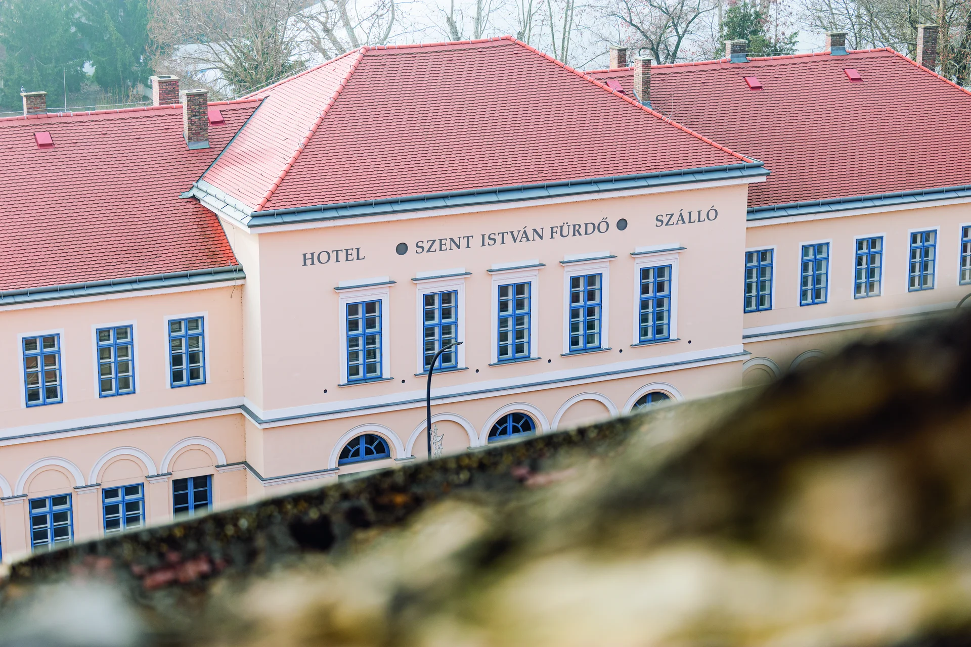 Az esztergomi Szent Tamás-hegy lábánál fakadó hőforrásokat már a középkor embere is szívesen felkereste. A reformkorban fellendülő fürdőkultúrát kihasználva az esztergomi káptalan szállodaépítésbe fogott, a tervek elkészítésére Zofahl Lőrinc pesti építőmester kapott megbízást. Az 1842-ben átadott egyemeletes, kiemelt középrészében nagyteremmel rendelkező szálló hamarosan a helyi kulturális élet központjává vált. Liszt Ferenc, Kossuth Lajos és Széchenyi István is megfordult a falai között. Az 1960-as években a színházterem helyére új, az eredeti épülethez egyáltalán nem illeszkedő szárny épült, majd a rendszerváltás után a rendezetlen tulajdonviszonyok miatt a szálloda bezárt. Az üres, omladozó ház sokáig Esztergom szégyenfoltja volt, 2006-ban azonban elbontották a hatvanas évekbeli épületszárnyat. A város tulajdonába került épület végül a Kisfaludy Program keretében újulhatott meg. A műemléki elvek tiszteletben tartásával újragyártották az elpusztult klasszicista ablakokat, sőt, az oromzat eredeti felirata is visszakerült a helyére. A megújult épület így rövidesen ismét várja a vendégeket.