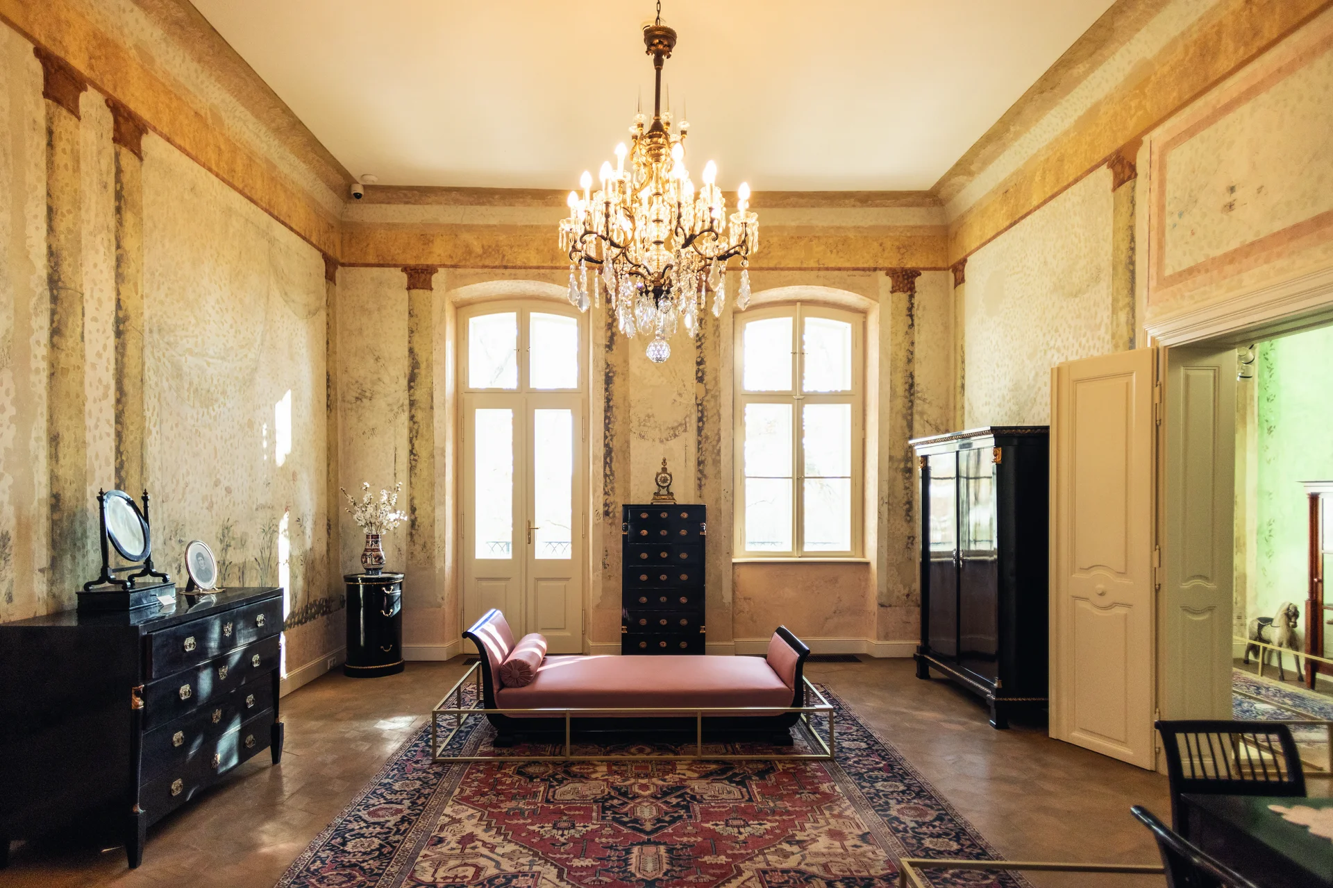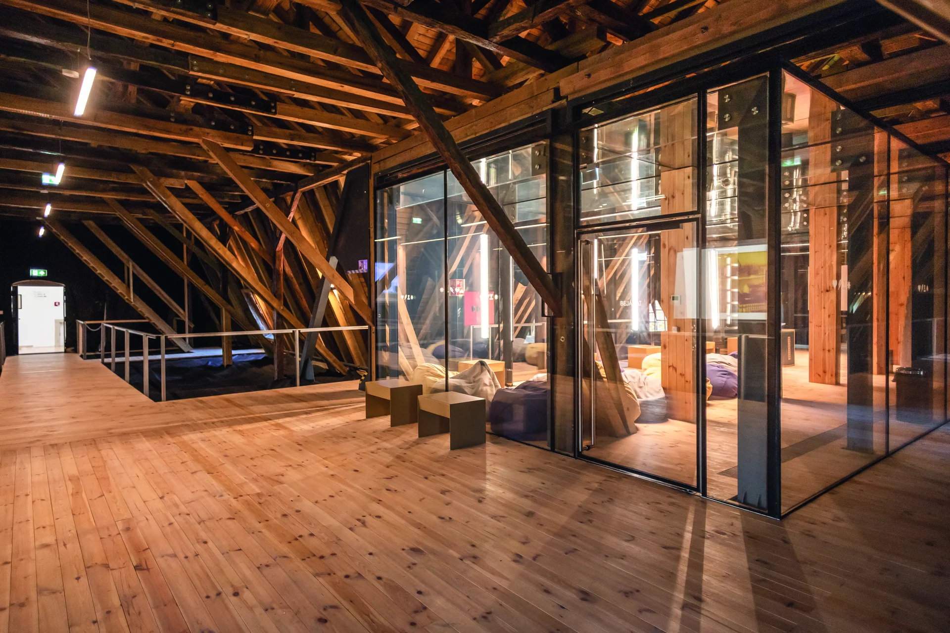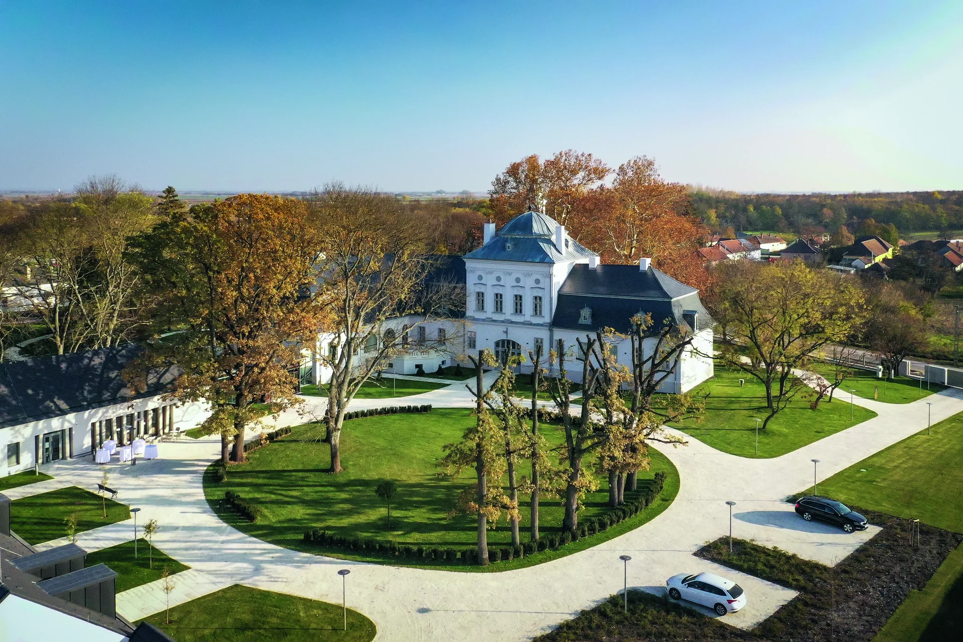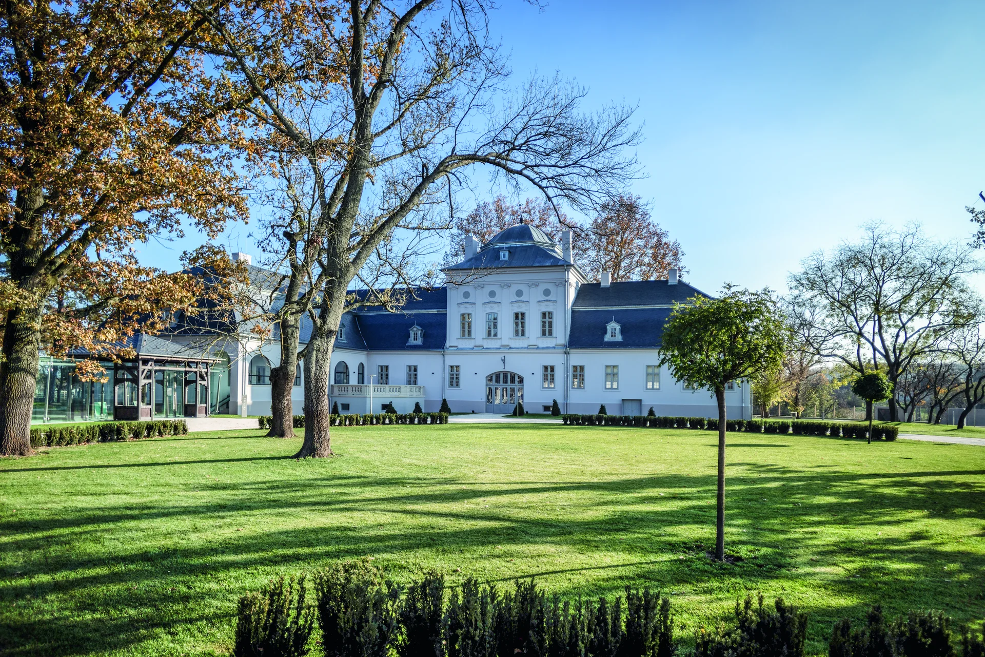 Határozott gesztusként jelenik meg az új épületet a kastéllyal a jellegzetes svájci stílusú pavilonon keresztül összekötő üvegfolyosó, ami történetiségét tekintve eredeti elem, mivel a korábban itt álló istálló-inaslak ezen a vonalon kapcsolódott a kastélyépülethez.