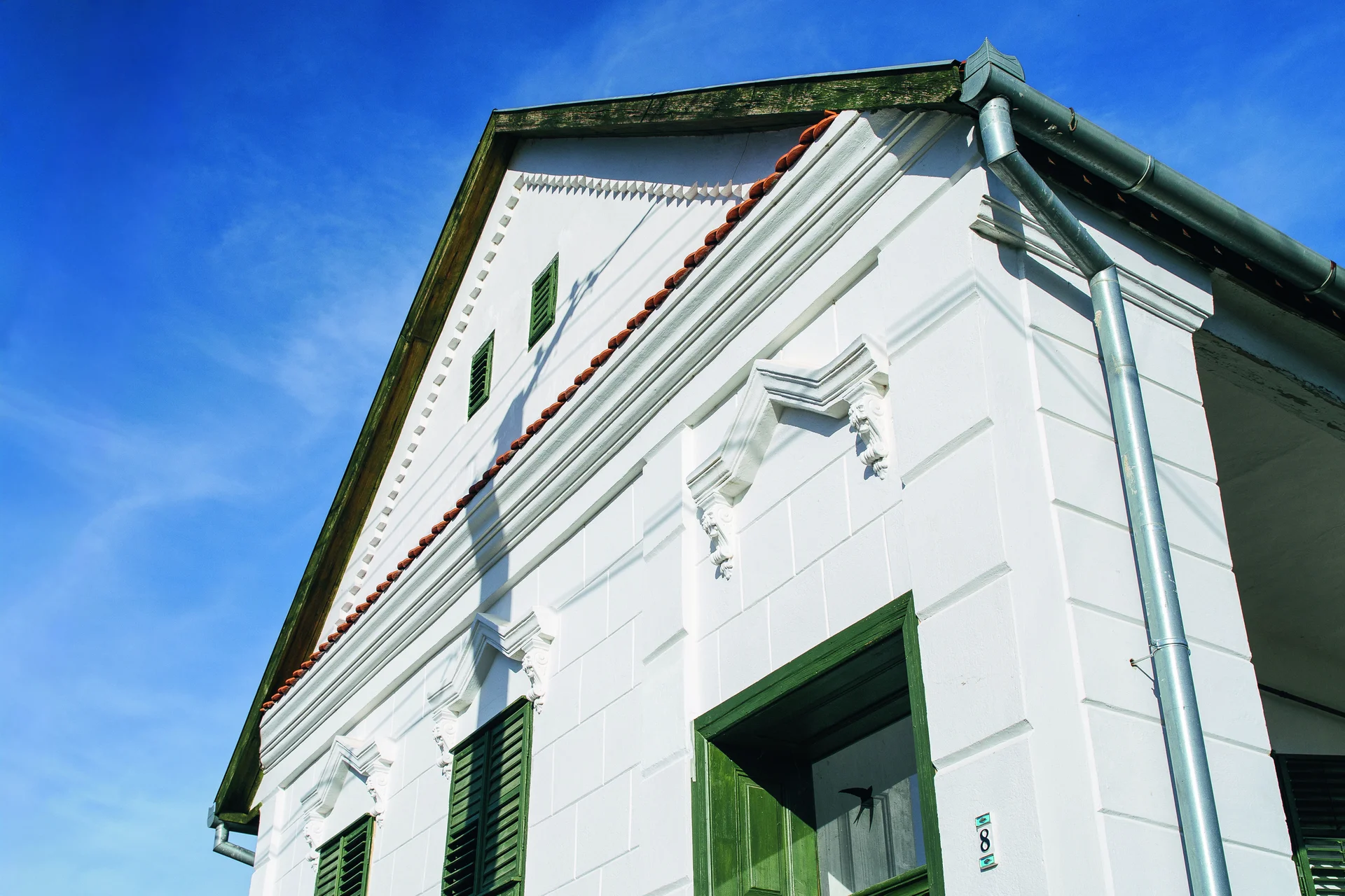 A Pécs közelében fekvő, háromszáz lakosú település nevét már az Árpád-korban, 1058-ban is feljegyezték, ekkor még Hashag formában. A falu lakosságának jelentős része ma is német nemzetiségűnek vallja magát, ami meghatározza a település arculatát és építészeti hagyományait. A helyi lakóépületekre jellemzőek a sváb karakterjegyek: általában két-három generációsak, téglából épültek cserépfedéssel, fehér vagy halványsárga homlokzattal. Az épületek az udvar felől gangról közelíthetők meg, a helyiségek egymás mögött sorakoznak, egyszerű, funkcionális alaprajzi rendet alkotva. A műemléki védettségű római katolikus templom mellett számos helyi védettség által őrzött hagyományos népi lakóház áll a faluban. A bemutatott épület helyreállítása során a homlokzat fehér színt kapott, az udvar felőli oldalon a gang falát kőlábazattal látták el. A védett értékként nyilvántartott nyílászárókat és az azokhoz tartozó, dupla zsalugátereket zöld színűre festették, és a cserépfedést is megújították. Az épület ma méltó példája a sváb lakóházépítési hagyományoknak.
