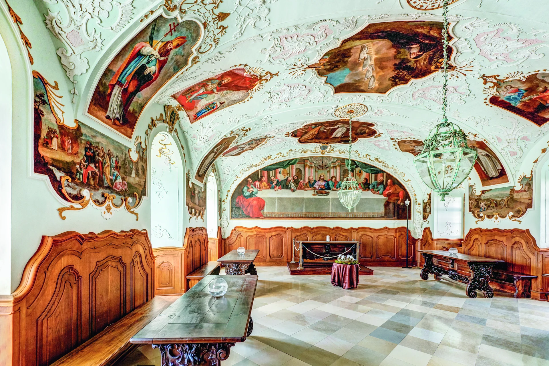 A remeték csak a legnagyobb ünnepeken étkeztek együtt ebben a díszes teremben. Falain Szent Romuald életét és az utolsó vacsorát ábrázoló freskók láthatók (refektórium, boltozatos, stukkókkal és freskókkal díszített ebédlőterem)