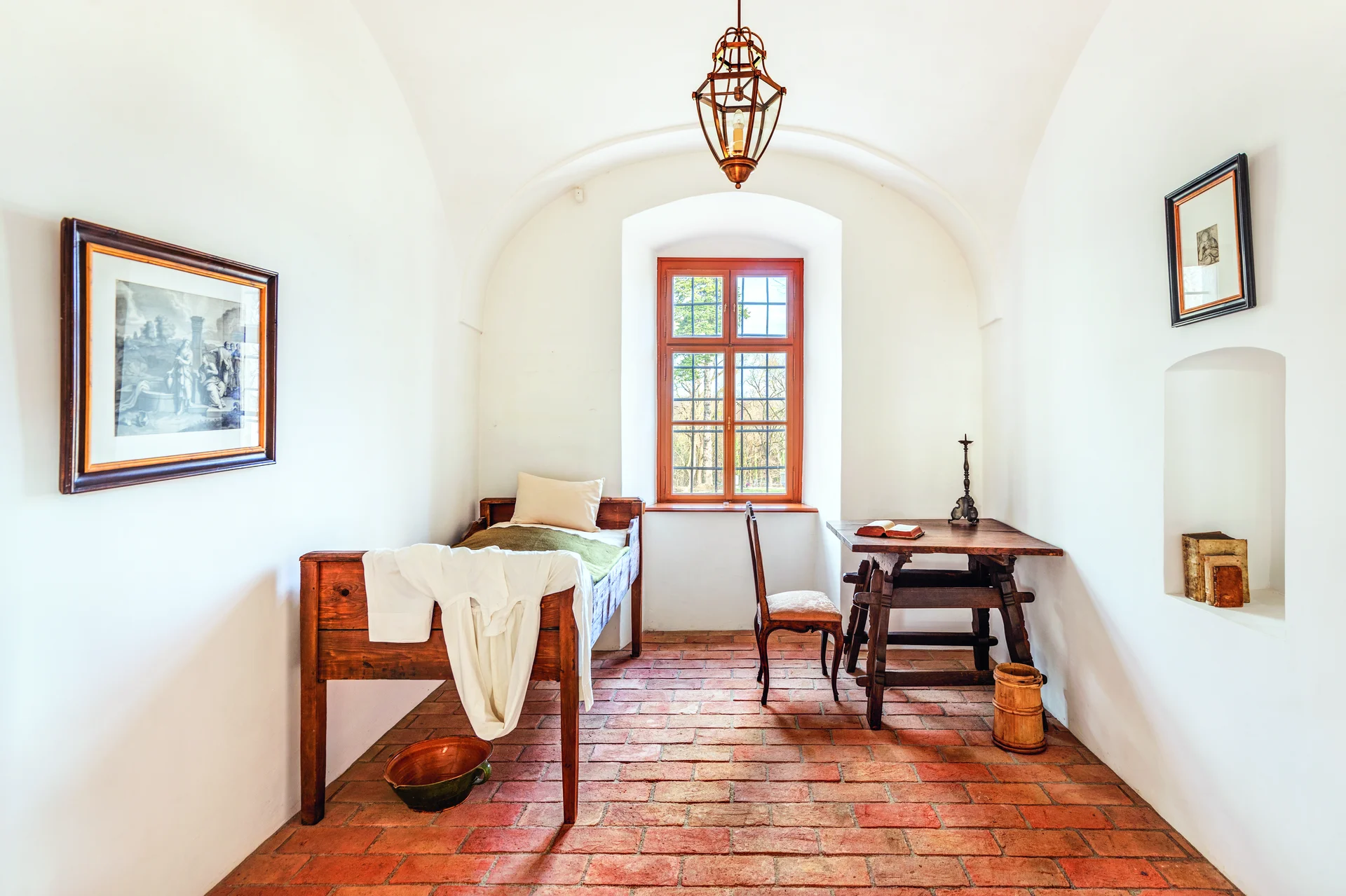 A remete napjait a cellájában töltötte: itt aludt, étkezett, olvasott és írt. A puritán belső tér hálófülkéből, dolgozószobából, apró kápolnából, kamrából állt, és tartozott hozzá egy kiskert (cellaház belülről – egyszerű berendezés)