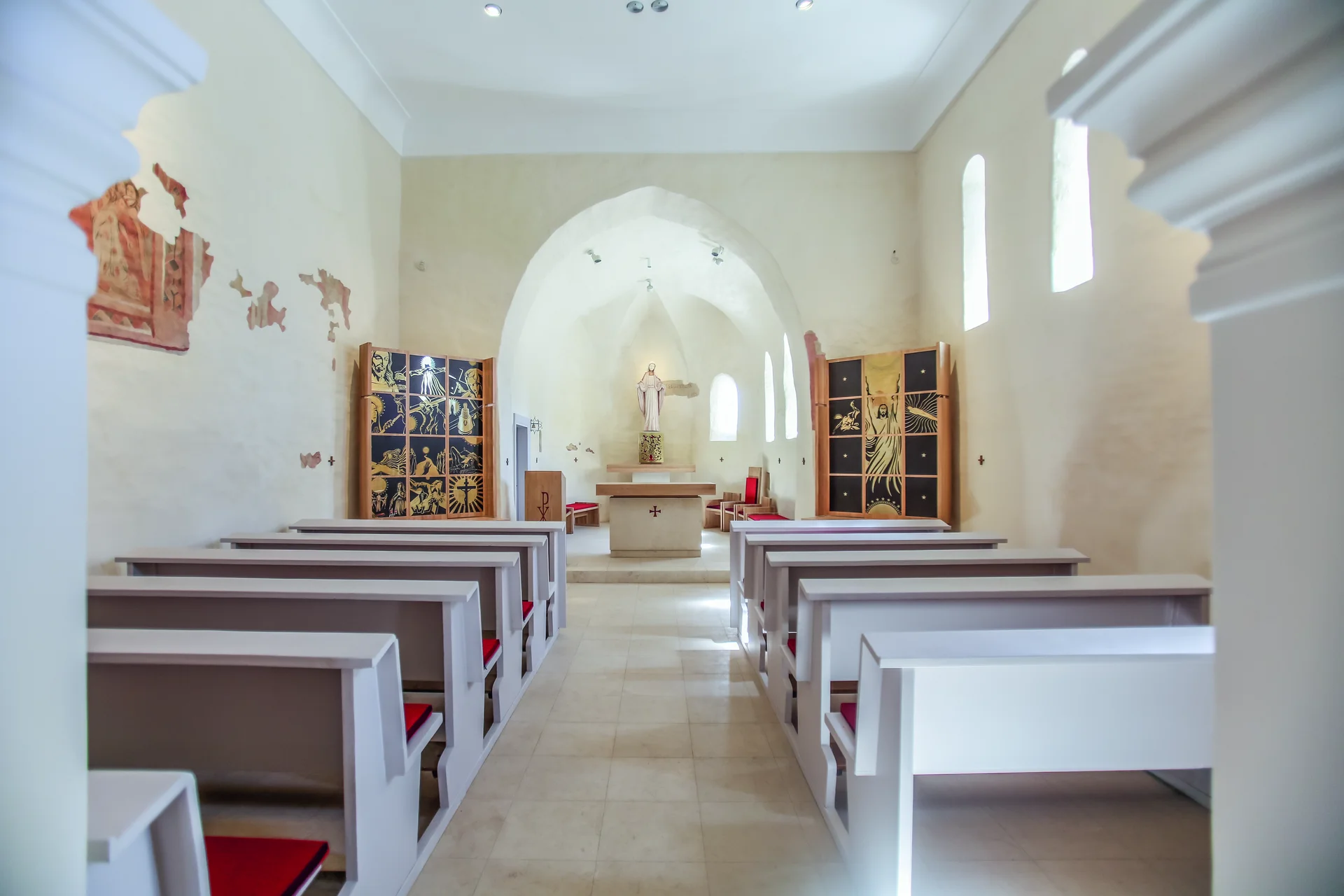A település híres kegytemplomának árnyékában meghúzódó épület egy darab „visszakapott középkor”. A sok átépítés miatt az épület teljesen jellegtelenné vált, noha szép arányai és támpillérei elárulták, hogy nagy érték rejtőzik a vakolatrétegek alatt. A régészeti feltárások során szinte szó szerint kihámozták a templomot a rárakódott rétegekből, így előbukkantak a 15. századi ablakok, az eredeti bejárat, a belsőben pedig freskók tárultak fel. Az építészek ezek alapján szerkesztették újra a középkori formákat, így a torony kettős ablakait vagy az eredeti ajtó keretét. Különösen nagy kihívást jelentett a belső tér megoldása, hiszen a több korból származó berendezési tárgyak szinte alig képviseltek értéket. Így egységes, a mai kort tükröző, ugyanakkor a divatos minimalizmustól mentes, míves és részletgazdag berendezés készült.