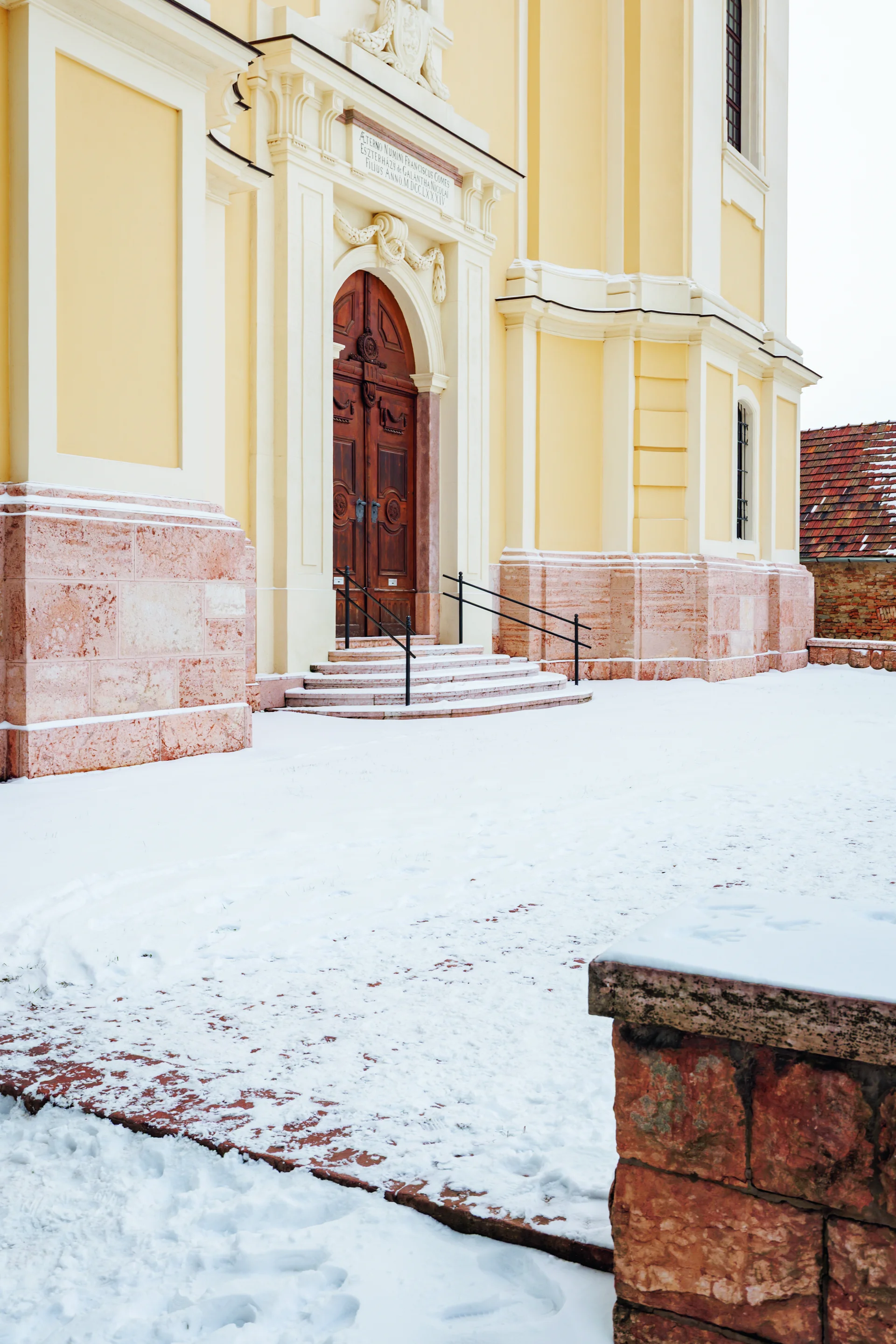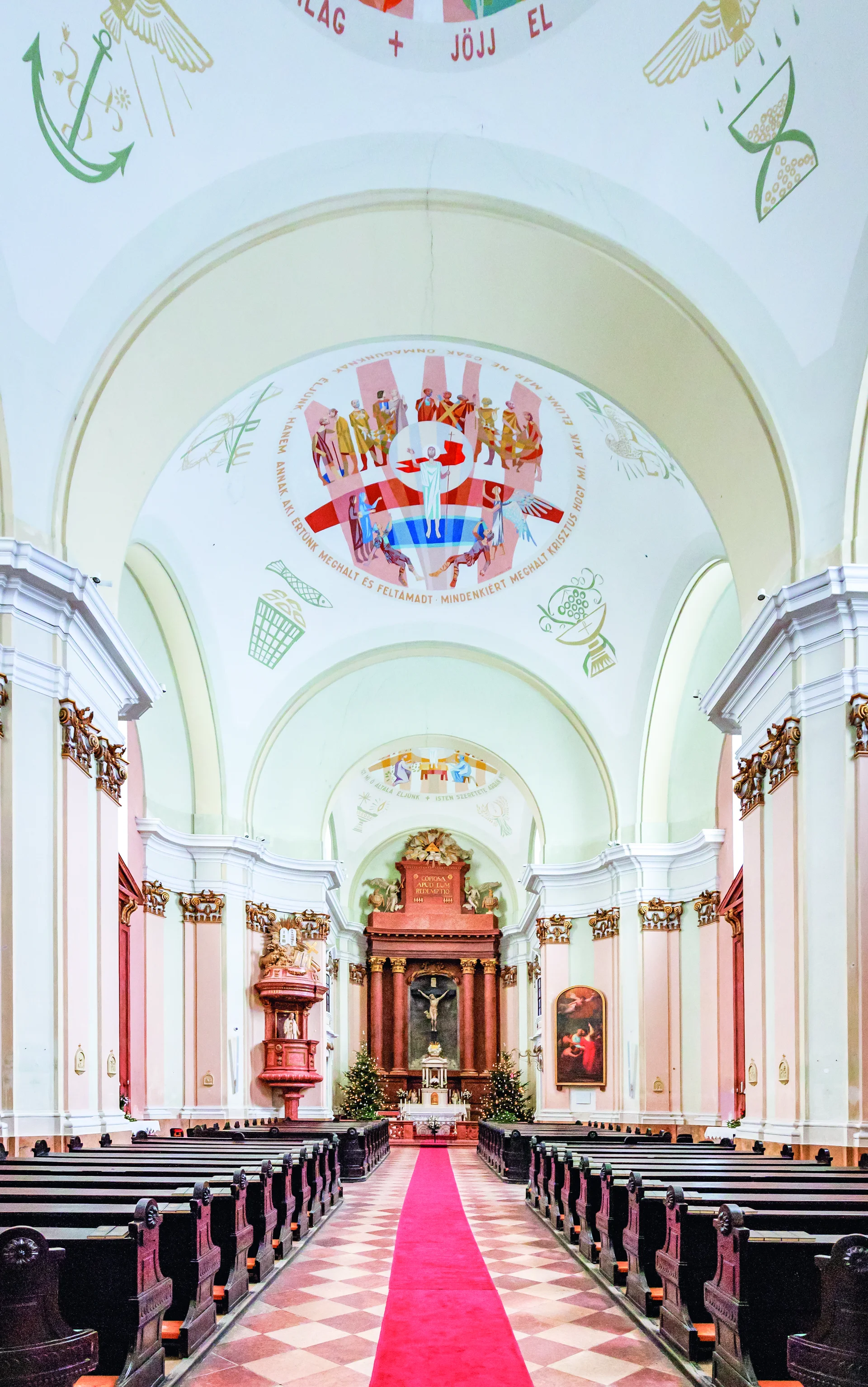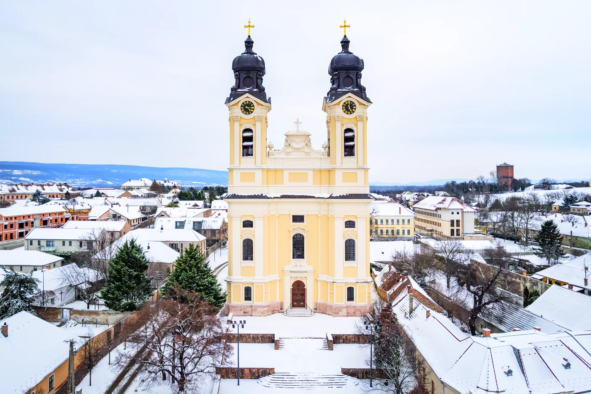Tata városképének meghatározó eleme a katolikus nagytemplom, aminek kettős tornya messziről uralja a tájat. A templom alapítása Esterházy Józsefhez, Tata és Komárom vármegye újjáépítőjéhez köthető, aki a tervek elkészítésével a neves osztrák építészt, Franz Anton Pilgramot bízta meg. A kutatások mégsem hozzá, hanem a család sokat foglalkoztatott építőmesteréhez, Fellner Jakabhoz kötik a végleges terveket. Fellner a klasszicizáló késő barokk stílus legnagyobb hazai mestere, amivel egyrészt megalapozta a nemzeti stílusként is számontartott klasszicizmust, másrészt nagyban emelte az országban az általános építészeti színvonalat. A tatai templom ennek a folyamatnak az egyik legszebb példája. Hatását tovább fokozza az 1940-ben készült nagyszabású szabadtéri lépcső, melynek oldalában állították fel a jeles tervező szobrát. Az időjárásnak leginkább kitett toronysisakok rekonstrukciója még 2009–2010-ben megtörtént, a templom teljes felújítása tíz évvel később zajlott. A homlokzatok mellett a nyílászárókat, többek között a remekműnek is beillő ajtókat is restaurálták.